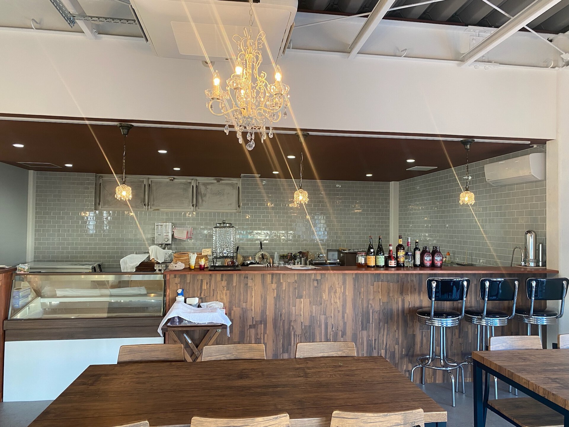 カフェネコジはガレット・ホットサンド・クレープのお店です。大きな窓から陽光が差し込む店内は明るくカジュアル。シャンデリアとタイル張りのオープンキッチンで解放感ある空間です。
